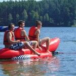 JAZDA NA BANANIE – zapraszamy na śmiganie na bananie. Bezpieczna zabawa na 3 osobowym dmuchanym bananie na jeziorze Wielewskim! Zajęcia pod opieką instruktora.